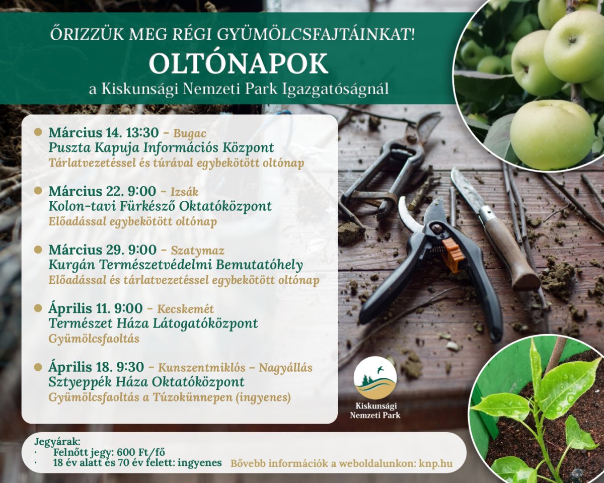 Részletek és jelentkezés: https://www.knp.hu/hu/programok/orizzuk-meg-regi-gyumolcsfajtainkat-tarlatvezetessel-egybekotott-oltonap-a-puszta-kapuja-informacios-kozpontban-805