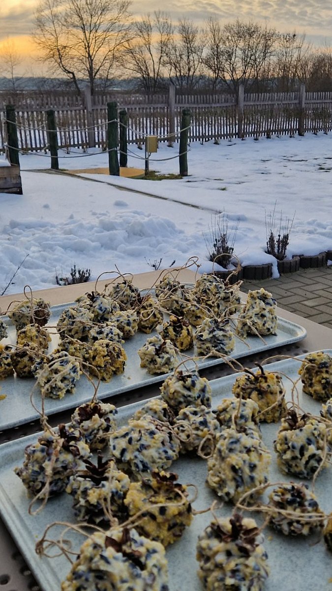 Az időközben megszilárdult kis fenyőtoboz-madáretetőket – amik egyébként leginkább a raffaello golyócskákhoz hasonlítottak -, a madzagjuknál fogva, közösen felaggattuk a Puszta Kapuja udvarán lévő bokorsorra. Persze ezt megelőzően mindenki tehetett el a madáreleségből, hogy otthon is kihelyezhesse a kertje madarainak.