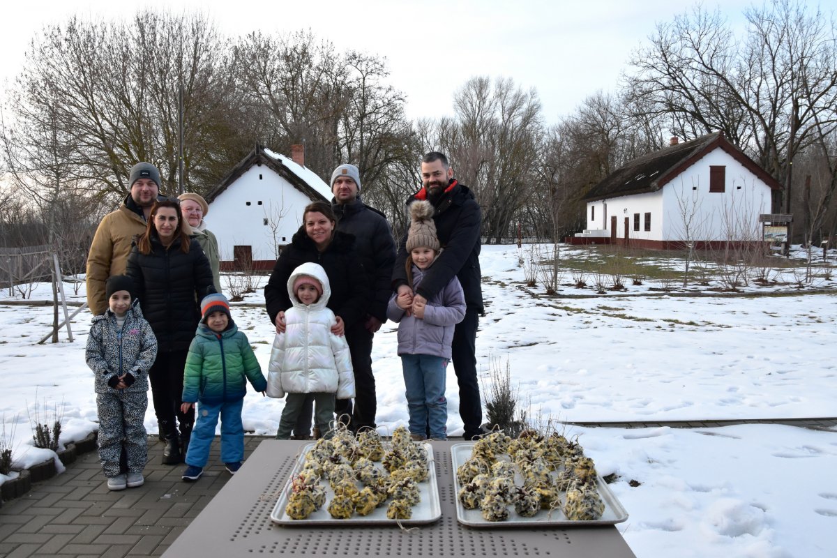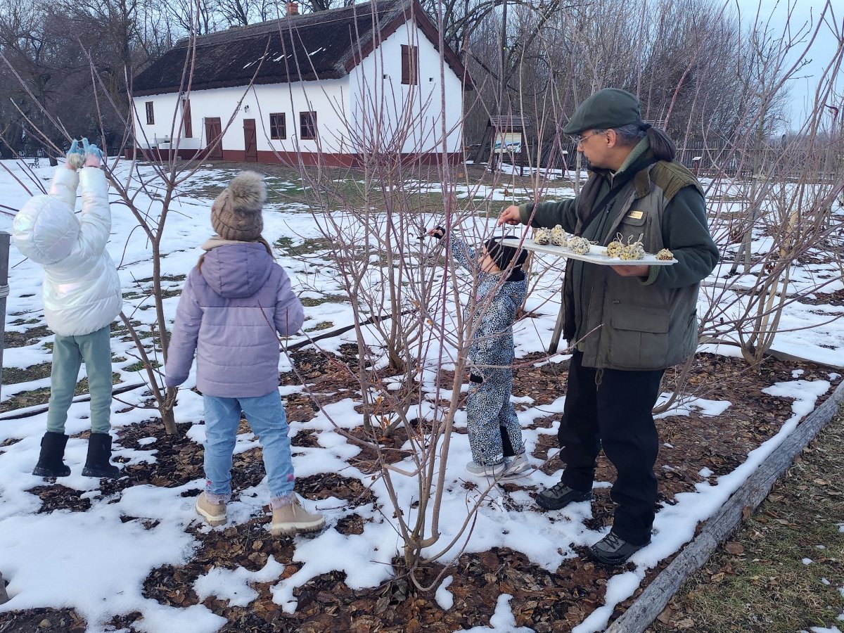 Ezt követően a már előkészített, olvasztott faggyúba kevert magvakkal töltöttük meg a madzaggal ellátott fenyőtobozokat, tetszetős kis madáreleséget készítve így. A kész alkotásokat kivittük a hidegre. Amíg a faggyú megdermedt, s így megszilárdult a madaraknak szánt táplálék, addig a gyerekek kihasználták a még el nem olvadt havat, és hatalmas hancúrozás indult. A felnőttekkel közben a Buzsik-csőszház történetéről beszélgettünk.