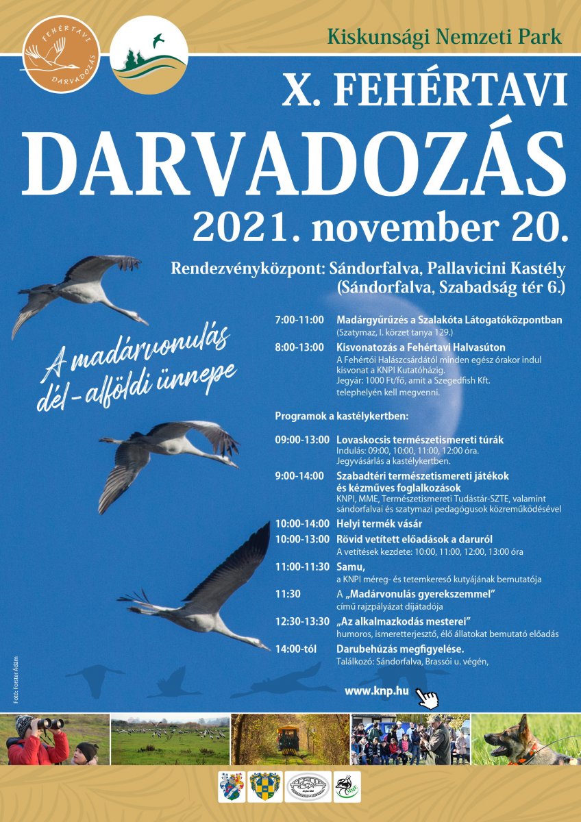 Idén már 10. alkalommal rendezzük meg a Fehértavi Darvadozás – a madárvonulás dél-alföldi ünnepe elnevezésű népszerű rendezvényünket. 2021. november 20-án a szegedi Fehér-tónál, Sándorfalván várjuk az érdeklődőket. A családi programok délután darubehúzással zárulnak.