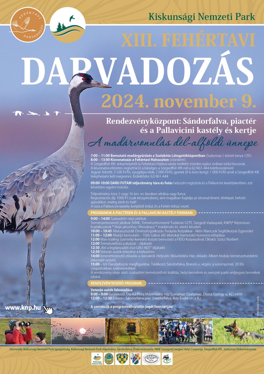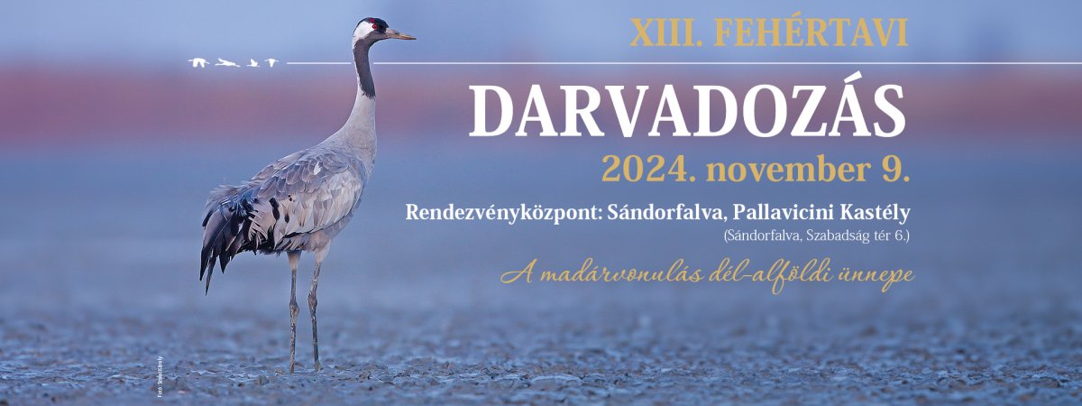 November 9-én tizenharmadik alkalommal rendezzük meg a Fehértavi Darvadozás – a madárvonulás dél-alföldi ünnepe elnevezésű népszerű rendezvényünket a Szegedi Fehér-tónál. A rendezvényközpont idén is Sándorfalva, a Pallavicini-kastély mögötti piactér és udvar, valamint a Szalakóta Látogatóközpont.